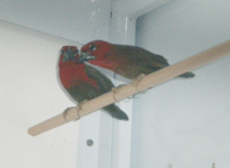 Non ho mai provato ad allevare questo estrildide. Molto docile e calmo la sua riproduzione in cattività risulta molto difficile. Il dimorfismo sessuale è evidente in quanto il maschio presenta un disegno color rosso più esteso della femmina.