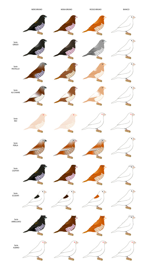 Purtroppo sia io che Sergio allevatori di passero del Giappone abbiamo dovuto rinunciare a malincuore alla standardizzazione della mutazione pastello su base nero bruno e della mutazione ali chiare sempre su base nero bruno, varietà ancora in studio e non riconosciute a livello C.O.M.. In compenso abbiamo però convinto la C.T.N. I.E.I. a richiedere presso gli organi competenti l’ allargamento delle categorie del passero del Giappone a partire dal Campionato Italiano 2012. Le categorie allargate sono ancora da definire bene ma da due passerebbero ad undici.