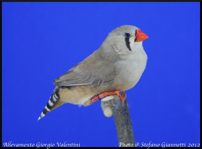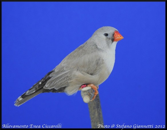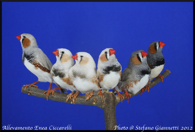 Avevamo concluso così tutta la serie di fotografie che ci eravamo proposti di fare, mancava però un solo scatto, più che altro una scommessa. In occasione di Faenza aveva preso un mandarino Eumax/Seifert, in pratica un Grigio Mascherato molto carico, quasi grigio sul dorso con guancia e fianco molto carichi, soggetti usati per caricare appunto i Mascherati proprio sulla guancia e sul fianco. Avendo preso questo soggetto nelle varie discussioni che facciamo sul forum del Passero del Giappone, dove di disquisisce di genetica ad alti livelli, e dove io arranco a capire qualche cosa, l’amico Sergio Lucarini aveva commentato così la notizia di questo nuovo acquisto “In effetti una bella sequenza di foto di tutte le varietà alleliche potrebbe essere utile per un articoletto sulla attuale situazione del locus “riduzione”. Se non sbaglio a questo punto dovrebbero essere sei gli alleli conosciuti: ancestrale, dorso chiaro, eumax, masch. oo.nn., masch. oo.rr., ino.” Avevamo preso questa battuta di Sergio come una sfida per potergli regalare uno scatto tanto difficile quanto unico. E così ci siamo dati quindici minuti di tempo per poter tentare lo scatto dei sei Mandarini in contemporanea, fotografare sei mandarini adulti, maschi, contemporaneamente su un posatoio in un box fotografico non lo avevo mai fatto, ed all’inizio i tentativi erano praticamente nulli, con un po’ di calma li abbiamo lasciato riposare un po’, provavo a fare degli scatti, ma più di 4 soggetti in contemporanea non riuscivo a riprendere, un vero peccato. Enea si era spazientito ed era salito a casa, io sono rimasto un altro paio di minuti e come per magia i sei mandarini si sono fatti accomodare sul posatoio, l’ordine non era in scala ma l’importante era riprenderli tutti e sei contemporaneamente, e ce l’avevamo fatta. Sceso Enea è rimasto stupito dalla riuscita dello scatto. Missione compiuta, la foto per Sergio è stata scattata!