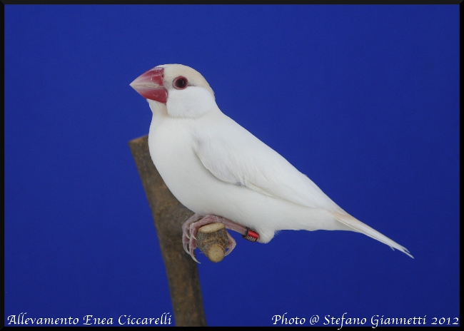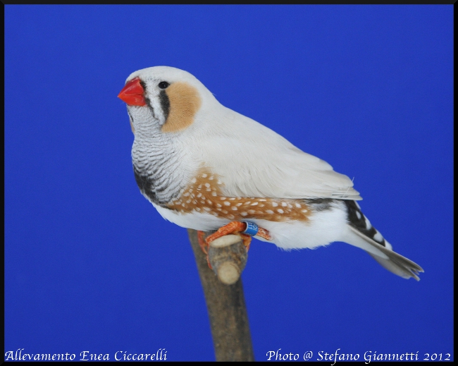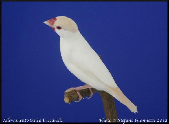 Terminate le nostre foto è arrivato Giorgio con un trasportino e dentro i soggetti di cui ci aveva parlato la mattina, ed oltre al Diamante Pappagallo lutino, ha portato una delle sue fantastiche Gola tagliata Albine, un bellissimo Diamante Guttato mutato ed una fantastica Mandarini Bruna, un soggetto migliore dell’altro, e con mi soddisfazione e spero anche la loro sono riuscito a fotografare. Il Diamante Pappagallo lutino, una femmina per la precisione, non aveva un piumaggio in forma perfetta, ma la rarità del soggetto meritava uno scatto a tutti i costi, salvaguardando però sempre il benessere dell’uccello, che comunque si è dimostrato docile e si è fatto fotografare senza denotare troppo stress e timore. Appena finiti gli scatti, Enea ha subito contattato Luigi Montini, perché lui con Giorgio sono stati gli artefici della trasferta Nordeuropea di inizio ottobre, che ha permesso l’arrivo in Italia di questa mutazione, e degli Eumo per Enea! Quando si parla di novità e primizie su esotici rari e mutazioni particolari Luigi è sempre il “colpevole”. Spero prima o poi di ripetere un bel servizio fotografico, con tutte le novità aggiunte in questi ultimi due anni!