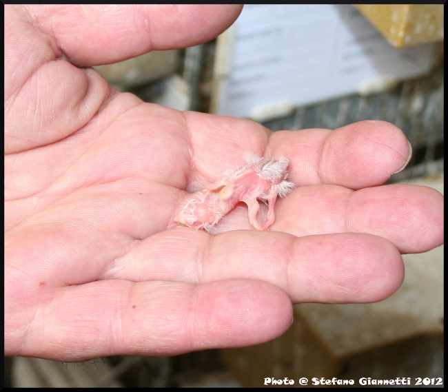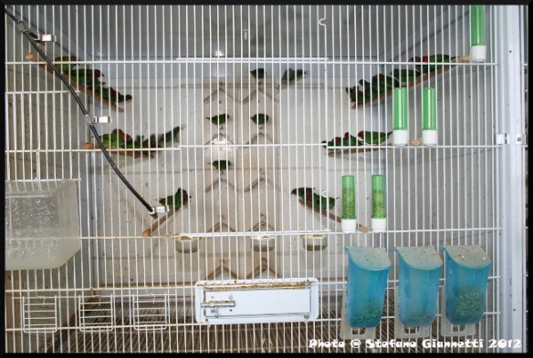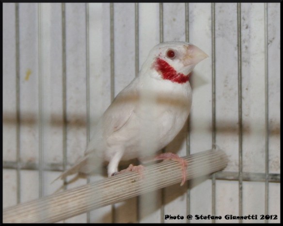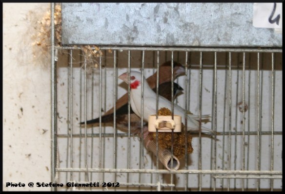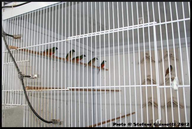 La bella voliera nel cortile come lo scorso anno ci ha attratto da subito, per la grandezza e soprattutto per gli abitanti, Guttati, Fringuelli, tanti altri piccoli esotici, Mandarini Grigio e Bruno, i mandarini di Giorgio che non hanno bisogno di presentazioni; nel locale tutte le gabbie sistemate in batteria, con molti nidi ancora pieni, i miei occhi subito sono andati verso le coppie di Petto Nero sistemate vicino all’entrata, ma Giorgio ha subito richiamato la nostra attenzione verso una gabbia, con orgoglio e compiacimento ci ha mostrato una delle sue bellissime e rarissime Golatagliate albine già svezzate, dall’altra parte un’altra ancora con le balie, e da un’altra parte una appena nata.