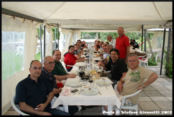 Avevo già potuto degustare le bontà tipiche teramane, e con altrettanto piacere ci è stato riproposto un menù della tradizione locale, a cominciare dall’antipasto di cui la portata più apprezzata perché unica sono state le mazzarelle, per passare poi al primo piatto, gli immancabili spaghetti alla chitarra alla teramana, naturalmente bissati, come secondo piatto un bel cosciotto d’agnello al forno contornato da patate ed insalata fresca, e per concludere il dolce, la pizza dolce alla teramana. Tutte le portate erano accompagnate dalla puntuale spiegazione di Luigi che da padrone di casa ci faceva da cicerone. Nel frattempo, nonostante la tavolata fosse lunga le chiacchiere non mancavano, e tra una portata ed un’altra l’oggetto del nostro parlare era sempre e solo quello l’ornitologia! Il meteo è stato per tutto il pranzo, come del resto lo è stato tutta la giornata, incerto, nuvoloni si affacciavano all’orizzonte, ma il gradevole venticello li spostava evitando così, il sempre imminente acquazzone.
