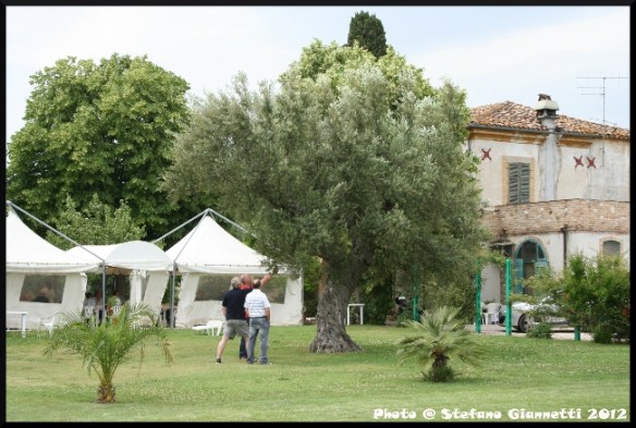 Dopo un aperitivo offertoci da Luigi nell’ennesimo nuovo locale, ci siamo incolonnati alla volta del ristorante dove eravamo stati il passato giugno, quando venni da Luigi per il servizio fotografico. Arrivati presso quella bellissima location ci ha accolti il forte odore dei tigli in fiore, che sovrastavano il bel casolare che ospitava il ristorante. La nostra tavolata era all’aperto sotto dei gazebo, tra ulivi secolari e ciliegi carichi di frutti, che spezzavano un verde prato e facevano da cornice ad un bellissimo panorama collinare con il mar Adriatico all’orizzonte.