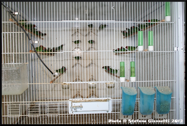 Rispetto alla visita dello scorso anno il locale allevamento aveva un aspetto completamente diverso, gli spazi sono raddoppiati unendo il vecchio al nuovo ambiente, dove su ogni parete disponibile era sistemata una batteria, colma di novelli e balie, il tutto seguito e organizzato in maniera quasi maniacale, tutti gli accessori disposti uniformemente per razionalizzare al massimo la gestione della distribuzione dell’alimentazione. Nei nuovi gabbioni da 1 mc facevano bella mostra una miriade di Coloria, Peale, Fetonte, Quadricolore più unici che rari, Gould incredibili come colori che come taglie, Codarossa, Kittlitz di tutte le mutazioni, Pappagallo, Tanimbar, Astri di Sidney, Bichenow, e tanti, tanti passeri del Giappone. Fortunatamente non è la prima volta che faccio visita da Luigi, ma ogni volta non si può non restare affascinati da tutto quel batter d’ali, sentire poi chiacchierare di riproduzione, genetica, alimentazione, ti fa capire che tutto quello che si vede non è frutto del caso o di fortuna, ma il tutto è studiato nel particolare per ottenere il massimo dando il massimo, 1200 novelli ne sono una prova tangibile. Eppure parlando con Luigi non tutti ne sono convinti, beh cosa poter rispondere a certe persone ”…..quando la volpe non arriva all’uva…..”.