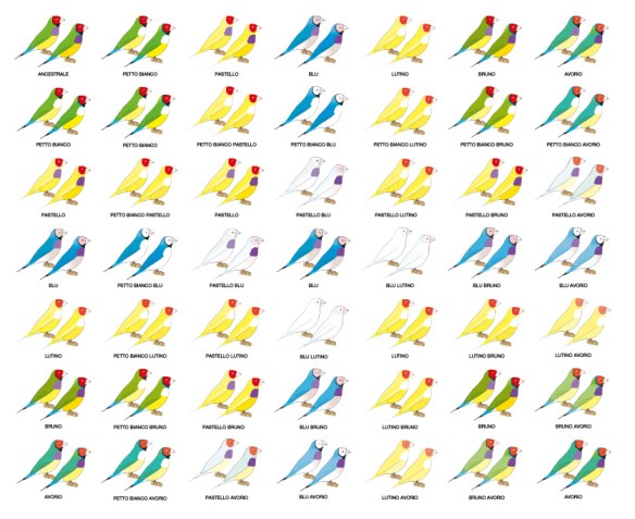 Per praticità e soprattutto per non creare confusione ho illustrato solo una delle tre forme presenti in natura, la “testa rossa” e elencato le mutazioni principali e attualmente riconosciute in ordine di comparizione: Petto bianco, Pastello, Blu, Lutino, Bruno e Avorio. Per quanto riguarda la mutazione Pastello ho illustrato solo i mutati cioè quelli che vengono definiti “doppio fattore” e non la forma intermedia, i maschi portatori della mutazione che vengono comunemente chiamati “singolo fattore”.