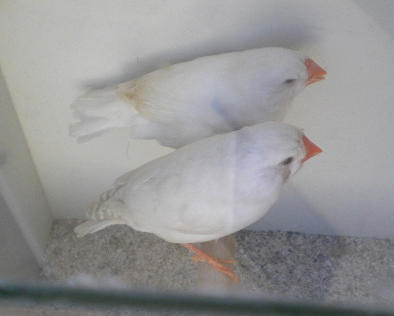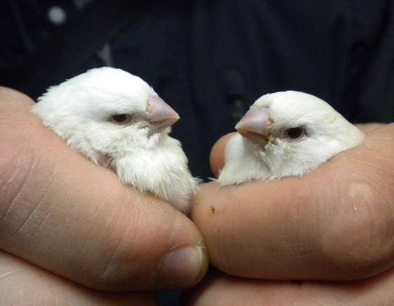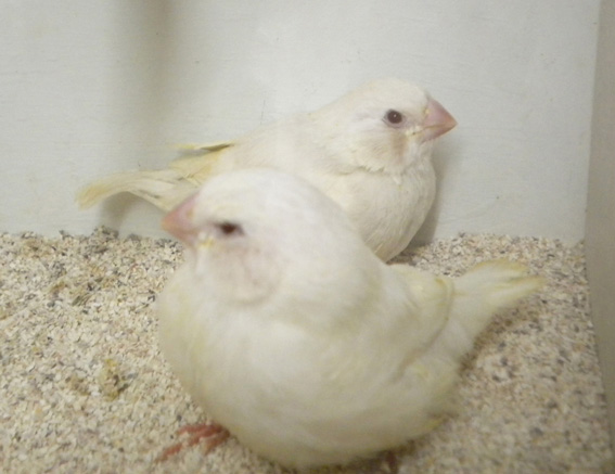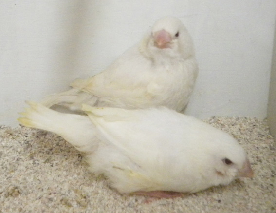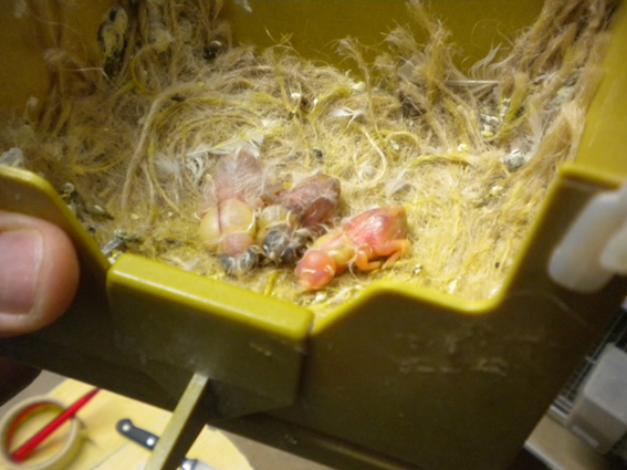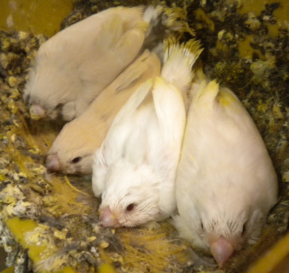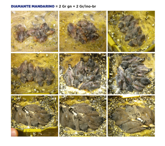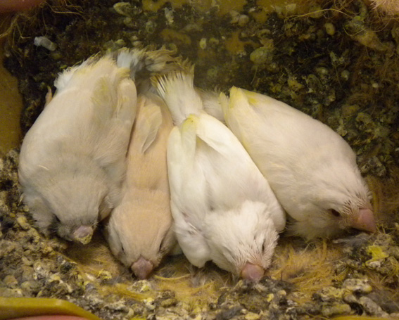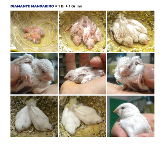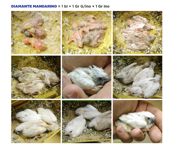 La coppia (Grigio ino x bruno guancia) si mostrò da subito molto affiatata e le prime uova risultarono subito feconde, le spostai subito sotto un’altra coppia con l’auspicio di avere una seconda deposizione nel giro di una settimana. Dalla prima covata nacquero due maschi grigio portatori di ino e bruno dalla pelle scurissima quasi nera e due femmine ino dalla pelle chiarissima color rosa salmone. Questa forte diversità della prole porta quasi sempre alla morte dei soggetti ino in covate miste come questa in quanto i genitori imbeccano di più i pulcini scuri fortemente più loquaci dei timidi soggetti ino che di conseguenza deperiscono e muoiono. Così forte di esperienze passate onde evitare spiacevoli conseguenze ho separato la prole, i due maschi grigio, li ho affidati ad una coppia di grigio guancia nera che aveva già due suoi piccoli pressoché identici per colore di pelle, mentre le due femmine ino le ho affidate ad una coppia di diamante mandarino bianchi che covavano uova infeconde. Fortunatamente per me entrambe le coppie balia hanno accettato i quattro piccoli alimentandoli senza problemi.