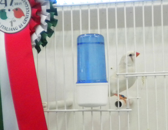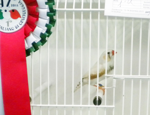 La coppia proveniva dall’allevamento di Sergio Lucarini, era composta da un maschio grigio mascherato portatore di ino, poi rivelatosi anche portatore di bruno ed una femmina grigio ino. Gli uccellini erano in perfetta forma ma considerato che i soggetti mutati ino a parere di molti allevatori erano alquanto delicati non nutrivo molte speranze di riuscita. Invece la prima esperienza con gli ino fu estremamente positiva, utilizzando altre coppie di diamante mandarino come balia da un unica coppia quella stagione riuscii a svezzare ben sei mutati, due maschi e quattro femmine grigio ino, due maschi grigio mascherato portatori di ino e 3 femmine bruno mascherato. Purtroppo in fase di muta una delle quattro femmine grigio ino morì facendo sfumare la mia idea di presentare per la prima volta uno stamm di diamante mandarino ino femmine. Accaparrato il sogno dello stamm ripiegai sui soggetti rimasti presentandoli come singoli in quasi tutte le mostre a cui partecipo abitualmente, esponendo quasi sempre un maschio ed una femmina, stando bene attento ad alternare i vari soggetti per non stressarli più di tanto visto la loro natura estremamente delicata. I miei soggetti presentavano un buon colore ma erano poveri di taglia e forma e nei vari show del 2011 sono stati letteralmente surclassati da soggetti qualitativamente migliori presentati da Stefano Giannetti e dallo stesso Sergio Lucarini. Nonostante questa evidente inferiorità selettiva ho continuato ad esporre i miei diamante mandarino grigio ino, con la speranza di farli più che altro notare e far conoscere questa “nuova” mutazione ai vari giudici ed allevatori. Grazie infatti alla buona informazione e collaborazione fra CTN IEI ed allevatori la mutazione ino a fine 2010 è stata finalmente standardizzata ed è stata creata per lei una categoria specifica sia nelle mostre specialistiche che al Campionato Italiano. Finalmente un lieto fine per questa mutazione non scomparsa grazie alla tenacia di una piccola cerchia di volenterosi allevatori, capeggiati da Lucarini. Dopo tutto questo “darsi da fare” quest’anno mi aspettavo una cospicua presenza di soggetti ino al Campionato Italiano di Pordenone, invece con mia sorpresa gli unici soggetti esposti erano i miei, così con i risicati punteggi di 90 e 91 punti, mi sono facilmente aggiudicato i due titoli in palio, sia nei maschi che nelle femmine.