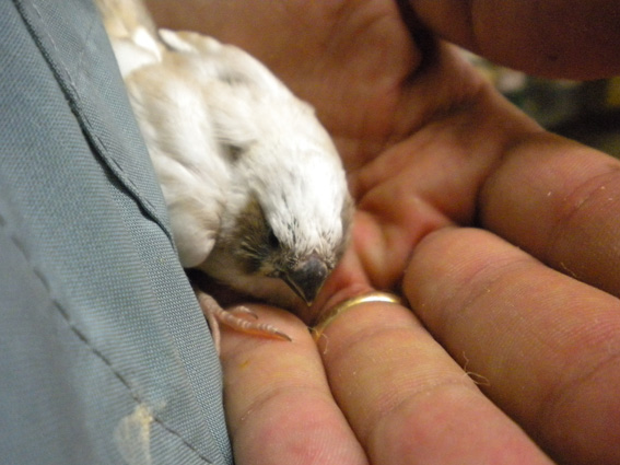 I primi quattro piccoli ora devono affrontare le difficili fasi di svezzamento e muta, fasi in cui molti mutati ino vanno in crisi e periscono in pochi giorni, non posso pensare quale delusione sarebbe per me se la femmina grigio ino guancia non ce la dovesse fare, quindi in questo periodo di tempo, preferisco concentrare la mia attenzione sulla seconda covata, spostata anch’essa subito sotto una coppia balia di diamante mandarino bianco x bruno pezzato portatore di bianco. Dalle quattro uova feconde nascono due femmine ino ed un maschio “strano” visibilmente più chiaro dei grigi precedenti e dalla pelle color bruno. Avrei potuto gioire pensando di aver ottenuto in maniera fortunosa per crossing-over un maschio bruno portatore di ino, ma la mia esperienza mi ha fatto subito intuire che quel soggetto “strano” dalla pelle brunastra non era altro che un grigio guancia portatore di ino e di bruno. Contemporaneamente nello stesso nido nascono anche due pulcini bianchi della coppia balia, così dato l’affollamento decido di dividere anche questa volta la prole, spostando un bianco ed una femmina ino sotto una coppia di passeri del Giappone in attesa che si schiuda il quarto ed ultimo uovo degli ino che però non si schiude.