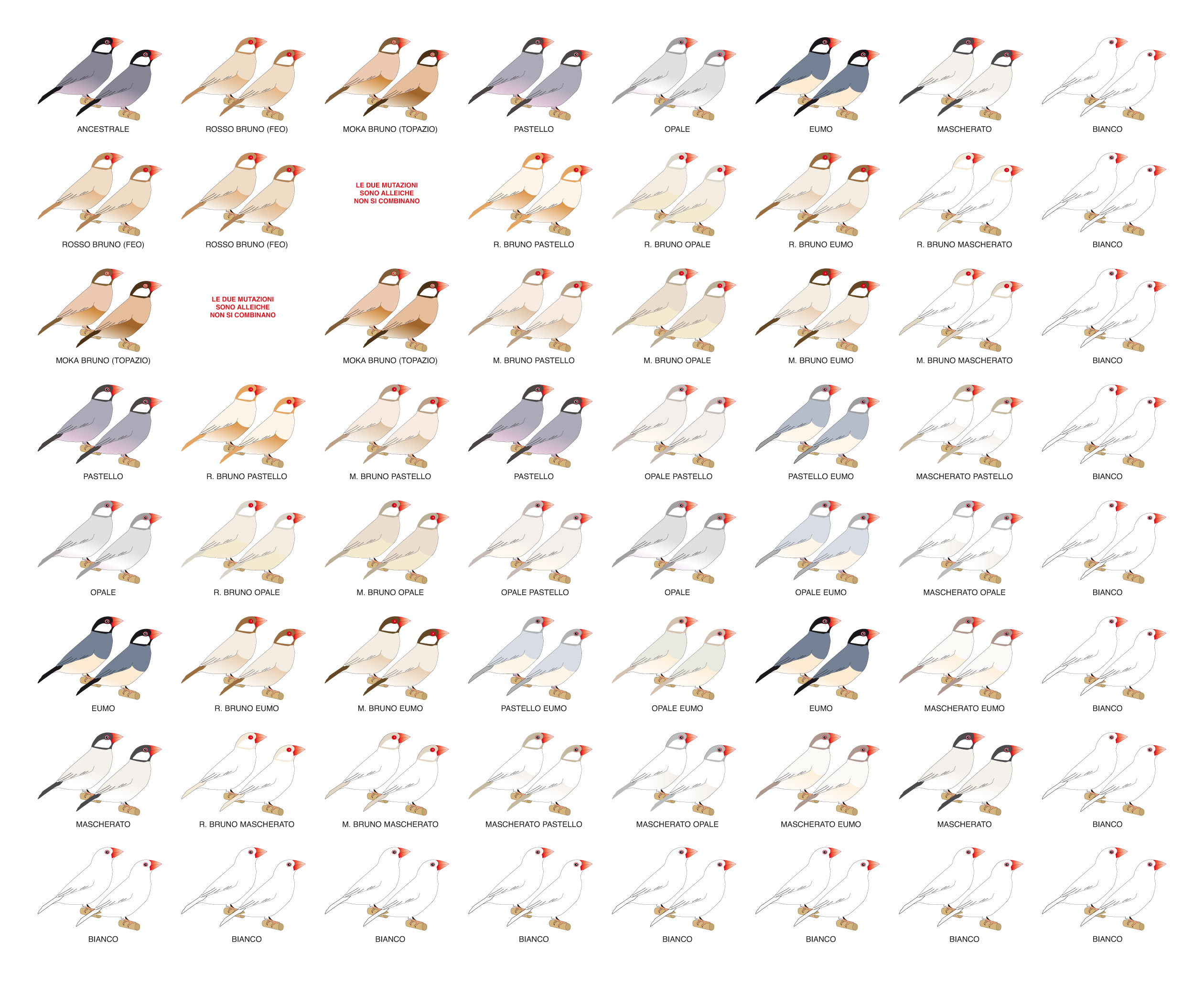 Come per il poster del diamante mandarino ho riassunto in questo mio schema le varie mutazioni del padda. In un ideale grafico ho inserito in un asse cartesiano X orizzontale ed Y verticale le varie mutazioni del padda presenti in Europa, l’incrocio di queste crea la doppia combinazione di mutazione. Alcune doppie combinazioni siamo abituati a vederle da anni nelle varie mostre, altre io non le ho mai viste, ma comunque ho provato ugualmente a disegnarle.