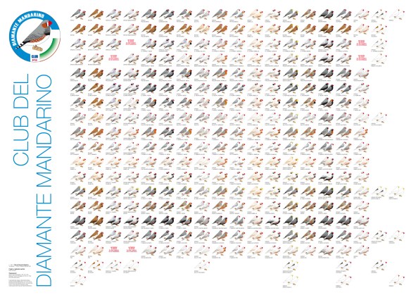 Alcune doppie combinazioni siamo abituati a vederle da anni nelle varie mostre, altre allora non le avevo mai viste, così ho provato ugualmente a disegnarle azzardando delle ipotesi a volte ardite, con il passare degli anni alcune combinazioni come il grigio ventre nero petto arancio sono state realizzate ed io non ho potuto che correggere mestamente la mia ipotetica illustrazione nella speranza che in futuro il poster possa essere ristampato. Tutto questo per dire che all’occhio più esperto risulteranno evidenti alcuni errori, ma che ai fini didattici comunque questo poster risulta essere uno strumento molto utile.