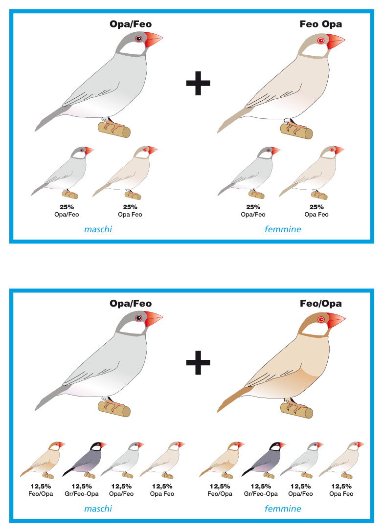 L’ accoppiamento migliore è opale portatore di feomelanico x opale feomelanico o viceversa, oppure consiglio di utilizzare due soggetti opale o feo che siano portatori della seconda mutazione, uno su quattro risulterà doppio combinato.