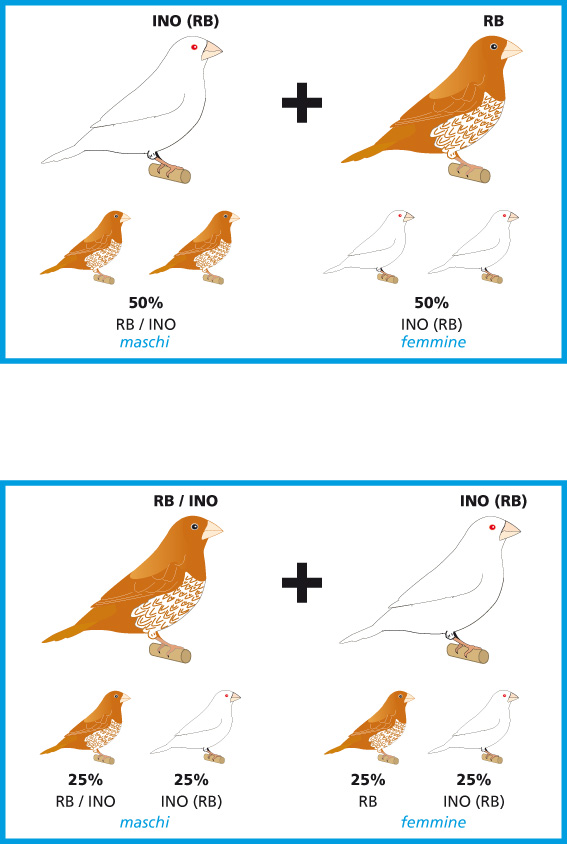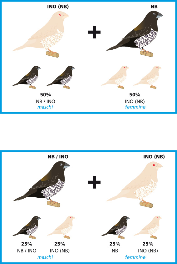 La selezione dell’ino rosso bruno invece mira all’uniformità del piumaggio in quanto i soggetti ino su questa base risultano essere degli apigmentati.